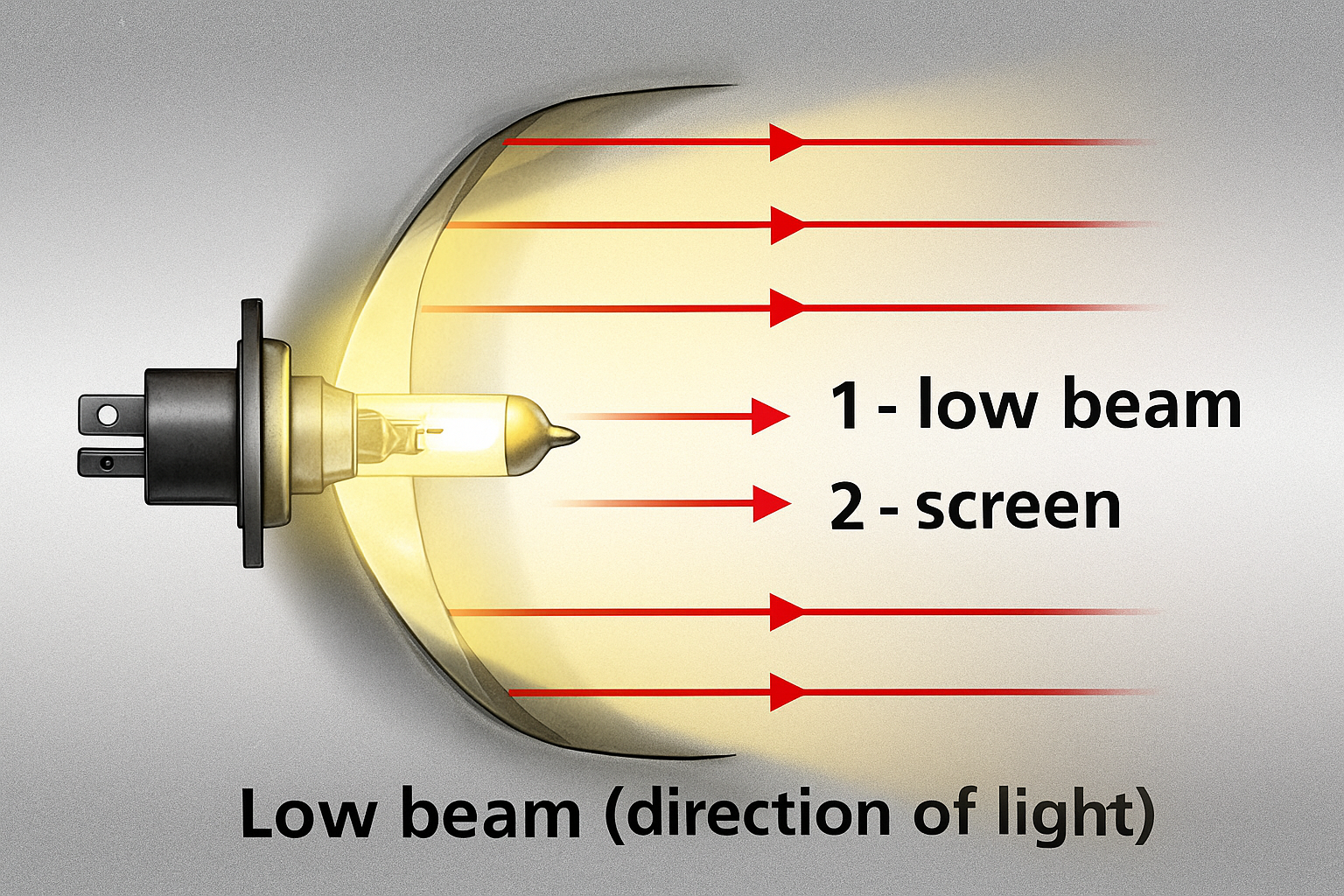 این لامپها معمولاً در چراغهای با طراحی رفلکتوری (Reflector Type) استفاده میشوند به این معنی که نور لامپ به صورت مستقیم تابیده نمیشود و نور پس از تابش بر روی بازتابنده یا همان رفلکتور، به سمت جلوی خودرو، بسته به نور بالا و پایین بودن چراغ خودرو تابیده میشود (مطابق تصویر زیر)