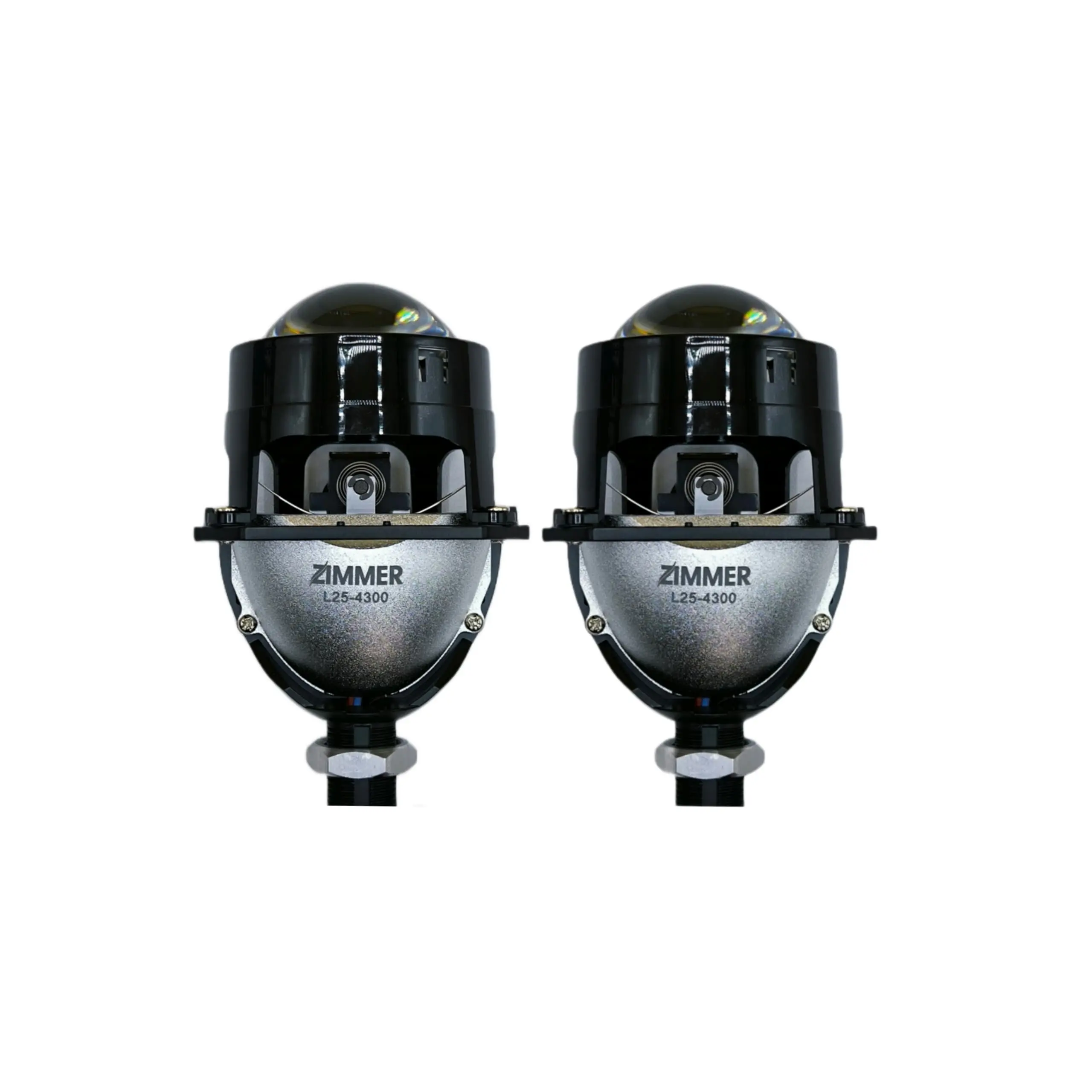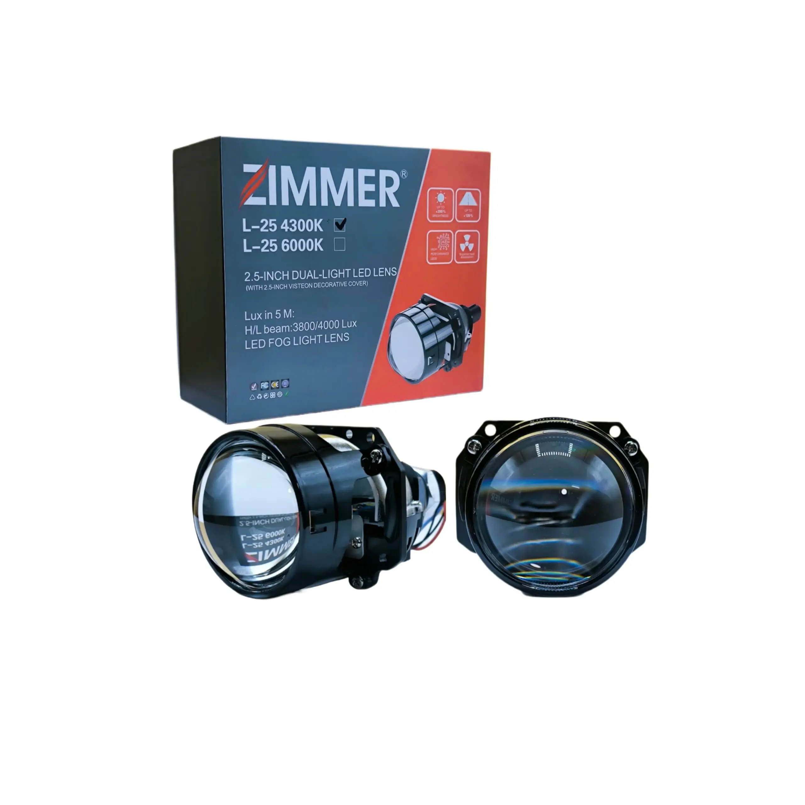 لنز ساده 2.5 اینچ زیمر با طیف نور 4300 کلوین که اصطلاحا آزرایی نیز گفته میشود. این طیف نور چیزی مابین نور سفید و نور لامپهای فابریک هالوژنی است که روی خودروهای ایرانی وجود دارد. برخی از رانندگان از این طیف نور استقبال بیشتری کرده و احساس راحتی رانندگی بیشتری دارند. نور بالای این لنز نیز به وسیله کات آف شیلد موجود در لنز فعال میشود؛ به این معنی که خط کات آفی که به صورت صاف و با یک شکستگی در وسط آن وجود دارد، برداشته شده و نور تا سطح بالاتری تابیده میشود. به نظر بنده نور بالای این طیف نوری (4300 کلوین) برای نور بالا زدن هنگام رانندگی در طول روز قابل مشاهده تر است و رانندگانی که قصد سبقت از آنها را دارید، شما را در آینه خود بهتر خواهند دید.